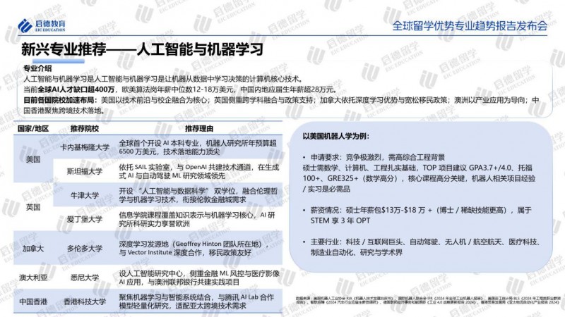 在机器人学、智能制造等领域,海外院校同样展现出鲜明特色。美国聚焦“AI+机器人”及航空航天材料研发;德国通过“工业4.0”将课程与企业需求结合;日本深耕服务机器人与高性能碳纤维;法国强化航空复合材料工艺教育。可持续发展方面,美国侧重ESG金融工具创新,欧盟重视合规教学,新加坡和中国香港建设亚太ESG金融枢纽。加拿大院校提供全面灵活的教育路径,涵盖AI融合机器人、可持续材料及ESG认证路径等多个应用领域。 |