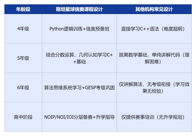 与其他机构课程的差异化优势 以家长关注的“信奥课程”为例,斯坦星球的阶段性设计更贴合孩子成长规律,对比其他机构优势明显: