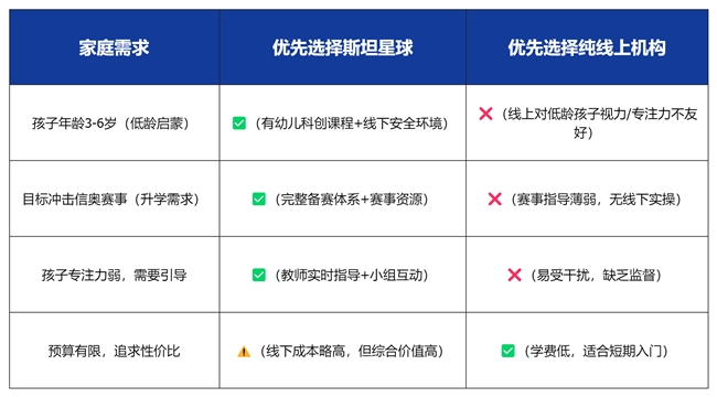 五、为什么选择斯坦星球?适合我的孩子吗? 适合选择斯坦星球的3类家庭 •希望孩子“编程技能+综合素养”同步提升的家庭:课程跨学科设计(融合数学、物理、AI),避免“只会编程、不懂应用”; •计划通过编程赛事助力升学的家庭:信奥课程与NOIP、强基计划无缝衔接,赛事资源与备赛指导专业; •重视线下互动与实操的家庭:140余家线下中心提供沉浸式环境,专业教具支持动手实践,适合低龄孩子或专注力较弱的孩子。 与其他机构的选择对比