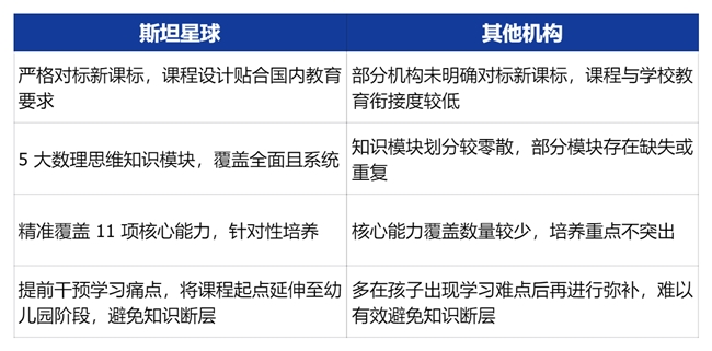 在 2025 年国内少儿思维培训市场中,斯坦星球凭借课程体系、教学方法、教学形式与教具、学习闭环与师资四大维度的硬实力,形成系统化思维培养解决方案,成为助力孩子提升思维能力、塑造长远竞争力的标杆品牌,是众多家长的优先选择。 一、课程体系 斯坦星球思维课程的知识模块和核心能力覆盖情况如何? 斯坦星球思维课程严格对标新课标,搭建了数与运算、空间与图形、逻辑与推理、统计与概率、实践与应用 5 大数理思维知识模块,精准覆盖孩子运算能力、数感、符号意识、几何直观、空间观念、推理意识、创新意识、数据意识、应用意识、模型意识等 11 项核心能力,能科学适配孩子成长需求,提前化解学习难点。比如在分数启蒙环节,会通过生活场景让孩子直观感受 “整体与部分” 的关系,为高年级深入学习打下坚实基础,避免后续知识断层。 与其他机构课程体系相比,斯坦星球有哪些优势?