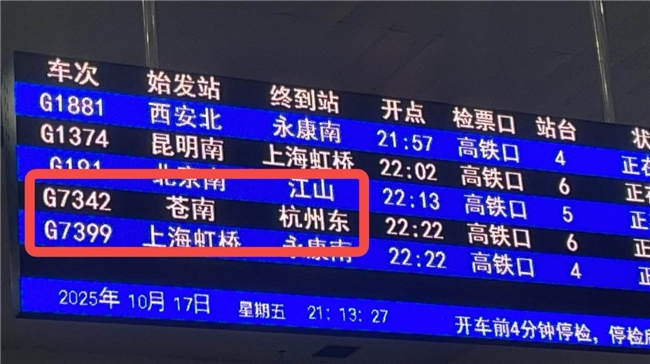 G7342次是由苍南站开往杭州东站的高速动车组列车,每日19:43从苍南站始发,22:38到达杭州东站,全程运行时间2小时55分钟。列车依次经停平阳、瑞安、温州南、丽水、武义北、金华南、诸暨等7个站点,停靠时间均为2-5分钟。 每周,海亮科技的清北朋辈导师们都会搭乘这列驶向午夜的列车。 它不只是一趟交通工具,更是一个流动的承诺。它承载着导师们的疲惫,也承载着期待——希望陪着每一个孩子,稳稳地开往他们想要的未来。 G7342次列车,大约22:22分在诸暨停靠,22:38抵达杭州东。 过去的一学期,李振天搭乘了27次这班列车。作为海科科技“清北学霸陪跑计划”的一名导师,他每周赴诸暨海亮教育园为同学们讲述自己的求学成长故事,开展深度的学业辅导,又匆匆搭乘这班回杭的最晚末班车回家。 课程排在晚上七点半到九点,下课铃响,并不意味着结束。“如果同学再问一下问题”,或是讲座后校长又多讲了一段,时间便被轻轻推后。从校区到高铁站,夜晚的打车“非常不稳定”。于是,他做出了最稳妥的选择:“我后来就索性只买最后一班了。” 而这天,又是G7342。站台上,白色的灯在晃动,时不时有列车“哗”就穿过去,当列车高速地通过站台的那一刻,他心想真像一个穿越小说的开头,于是他拍下了这张照片——想记录一下G7342的故事。
