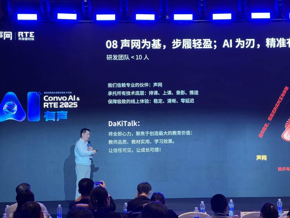 2025年11月1日,ConvoAI&RTE2025实时互联网大会在北京举行,在大会教育科技论坛上,DaKiTalk创始人赖荣明深入阐释了技术基础设施对在线教育品质的关键支撑作用。他提出的“声网为基,步履轻盈;AI为刃,精准有力”战略,展现了公司在技术合作与教育创新上的独特思考。