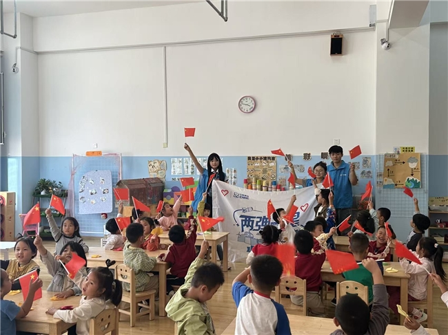 随后,活动现场响起了稚嫩而嘹亮的歌声。在宣讲团成员的带领下,孩子们挥舞着手中的小国旗,齐声传唱《歌唱祖国》等经典红歌。成员们趁热打铁,用孩子们能理解的语言,将科学家们投身研究时那份认真与坚持的精神融入讲解,在歌声与互动中,悄然传递着“艰苦奋斗”与“无私奉献”的精神内涵。