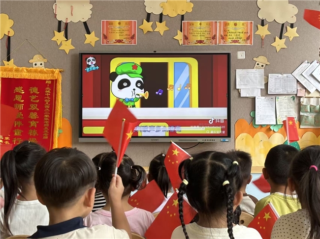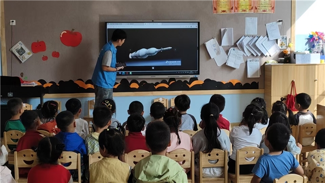 活动伊始,身着蓝色志愿马甲的宣讲团成员们,并没有进行艰深的理论讲解,而是选择了色彩鲜艳、情节生动的动画短片作为切入点。短片向孩子们展示了五星红旗、国家发展的宏伟画面,并讲述了“两弹一星”元勋们的故事,以此在孩子们心中建立起对祖国先锋与崇高精神的初步认知和崇敬之情。