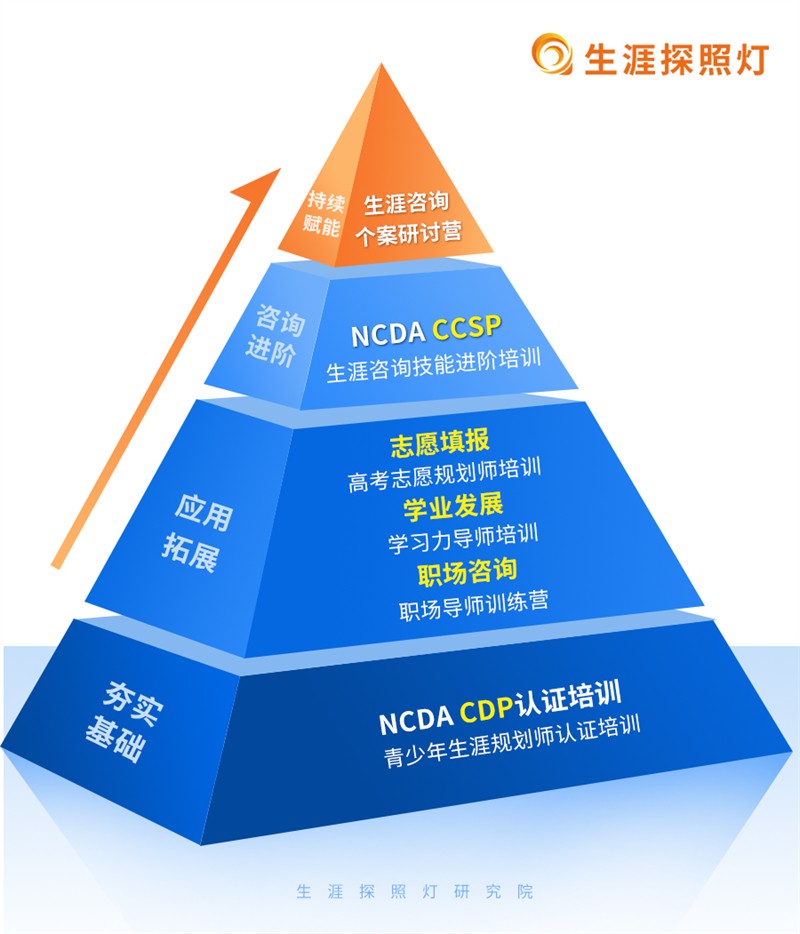 软件研发与 AI 支持 拥有 9 项软件著作权,覆盖: 学业提升与职业生涯测评系统 选科决策系统 AI就业助推系统 AI 心理陪伴系统 构建了一体化 AI 服务平台。包括AI职业生涯规划、AI就业、AI心理健康系统等平台,平台包含学业提升、职业生涯规划、简历辅导、面试辅导、对话智能测评、绘画智能测评、量表测评、心理陪伴、心理咨询、管理、干预、大数据看板等功能。 国际认证 生涯探照灯研发的职业生涯规划师系列课程,获国际生涯发展学会(NCDA)认可,成为国际生涯发展学会认证项目,学员完成课程并通过考核后可获得NCDA认证的国际证书,提升职业竞争力。 国际生涯发展学会(NCDA) 成立于 1913 年 国际权威、含金量高 国内职业生涯规划领域最具认可度的证书体系