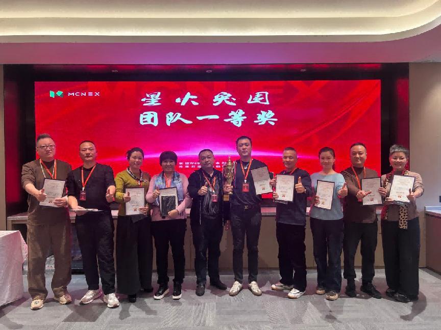 练习结束后,团队依次登台参与 PK,从需求挖掘到方案呈现,从风险解答到促成转化,各队的表现各有亮点:有的团队凭借清晰的逻辑获得评委认可,有的则以共情的沟通方式打动现场;个人赛环节更是高手云集,合伙人依次展示 “1 分钟产品价值提炼”,用简洁有力的表达诠释对 MCN 生态的理解。 当 PK 环节的分数统计完毕,颁奖盛典正式开启。现场大屏亮起奖项清单,掌声与欢呼瞬间点燃氛围: 个人奖:“星火突围个人第一名” 不仅收获了定制奖杯,还将带公司 LOGO 的精美茶具与 600 元现金收入囊中;2 位 “个人第二名” 各获 300 元现金与定制茶具;3 位 “个人第三名” 则拿到 200 元现金与同款茶具,手持奖品的获奖者们在镜头前笑意满满。 团队奖:“星火突围团队一等奖”“二等奖”“三等奖” 及 “优秀奖” 依次揭晓,获奖团队代表接过奖杯、证书与专属奖品,现场响起一波又一波的祝贺掌声。