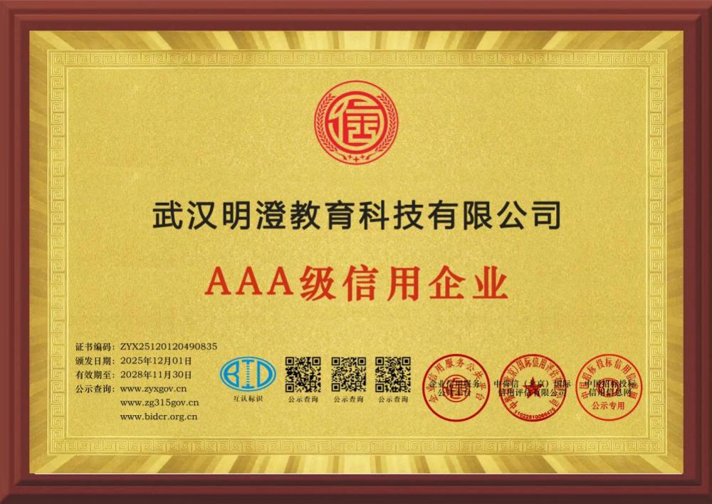 信用是金,满意是秤,这家武汉的教育科技公司在岁末交出了一份令人瞩目的诚信与服务答卷。2025年12月1日,武汉明澄教育科技有限公司正式获颁“AAA级企业信用等级证书”与“客户满意诚信企业”双重荣誉,成为湖北省学历提升服务领域的一颗明星。 AAA级信用认证是对企业经营状况、管理素质、财务状况、履约能力和行业声誉的全面肯定,代表企业在信用评价中的最高等级。