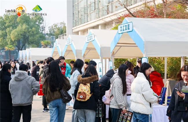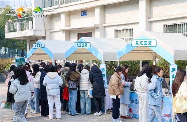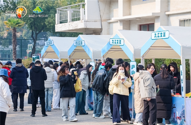 文旅市集“好吃好逛”。在场边设立的八大文旅市集摊位是另一处人气爆点。各展位前挤满了试吃特产、收集攻略、欣赏文创、扫码互动的学生。庐山的茶饼、浔阳的文创书签等成为热门礼品,不少学生边品尝边咨询寒假旅游线路。“没想到在学校就能体验到这么地道的九江味道,我已经计划放假去庐山看雪了!”一名大二学生兴奋地说。