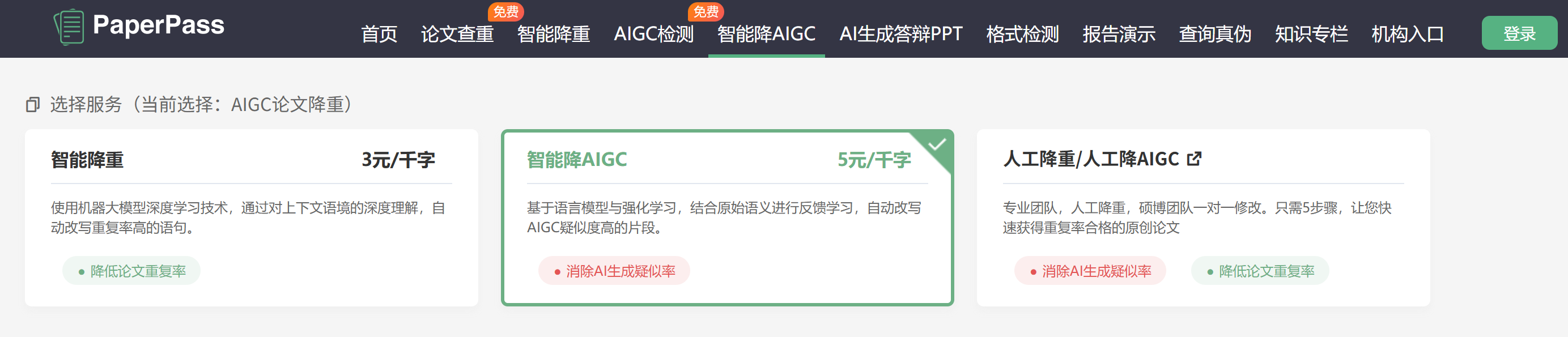 实测数据: 原始论文AI率是56%,处理后13%! 优势: 是一个综合性的平台,不仅仅有降AI率,也有生成答辩PPT、生成大纲等功能。 适用场景: 适合论文初稿降AI,且AIGC率中等(40%-60%)的用户。 4. PaperPass PaperPass是一个老牌的中文论文查重系统,提供职称、课题、高校毕业论文检测服务,最近1年也推出了降论文AIGC率的服务,有自己的论文库。