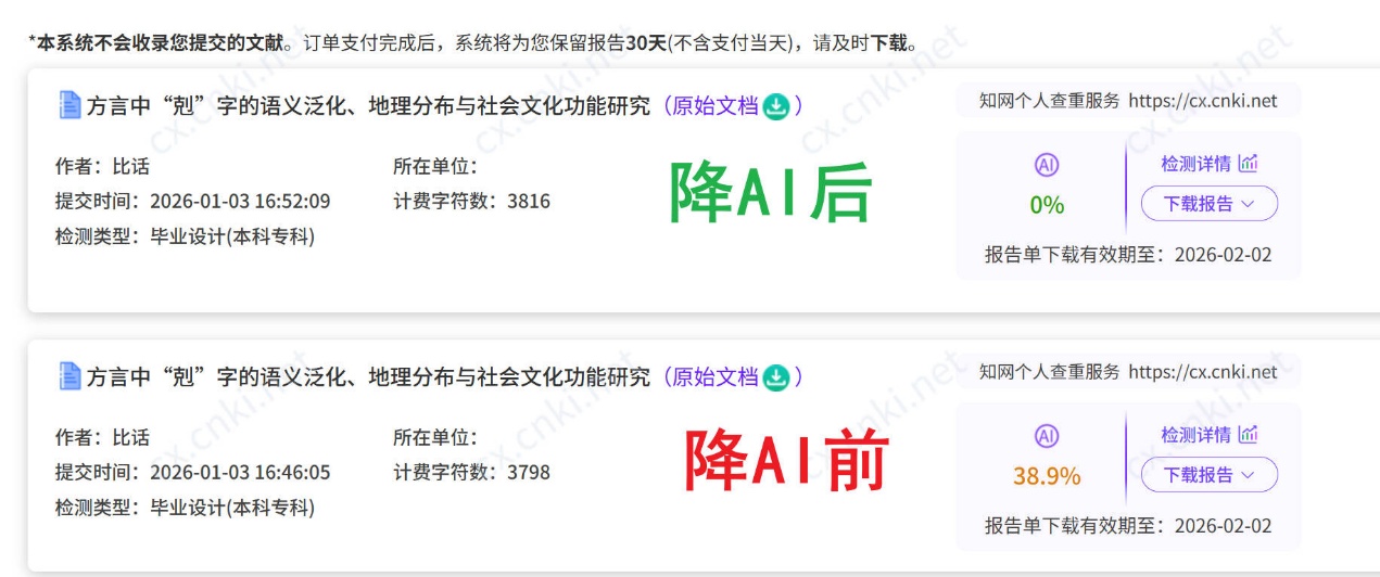 降AI数据:原始AI率56% 处理后AIGC率 27.5%。 适用场景: 提供5次免费AIGC检测,适合论文初稿或者平时小作业,以及学校没有指定论文AIGC查重平台的情况。 第三梯队:通用模型型(需人工指令) 这部分主要是介绍如何适用通用大模型,手动输入提示词(Prompt)进行降重降ai。 5.文心/deepseek /豆包 / Kimi等均可 实测数据: 直接处理效果较差,配合复杂指令(如“请模拟学术口吻,增加倒装句”)后,AIGC率可降至 15%-25%。 优点是免费,不需要任何成本。但是需要自己全程手动操作,逐句修改优化。 使用场景:论文AI率仅需下降10%-20%的情况,且不着急,可以自己手动降AI,去ai痕迹。 分享几个降AI指令: (1)口语化重写高频词(针对所有章节) 找出论文中所有AI高频词(如显著领域应用优势),用日常词替换:显著优势 → 真管用省了大功夫;广泛领域 → 到处都能用小到看病大到交通;应用 → 试试看实际用起来 (2)将这段文字通俗化,但不要有语气词,保留学术性,并降低AI痕迹,尽量把逗号多的融合成一句话,删掉逻辑联系词,删除双引号、减少比喻。 总结一下,并不是每个降AI率工具都是万能的,要根据你的论文状态,学校要求的AIGC检测平台,时间等因素来选择,才可以宣导性价比最高的降AI率工具,不踩坑。 如果是毕业论文初稿,就使用peperpass,有免费查AI率;如果不光光需要降重降AI,还有写作就用笔灵;如果是论文定稿就用嘎嘎降,嘎嘎降支持的平台多;如果学校指定要求知网AI率低于20%,那就用比话,降AI率效果好售后服务好。 如果你是2026年毕业生,建议按照这个流程去降论文AI率 (1)先使用学校指定的AI查重平台,一般是知网、万方、维普去检测AI率,如果吃初稿也可以用免费的朱雀(腾讯打造的免费AI率查重系统,每天有20次免费查AI) (2)根据AI率查重报告,使用嘎嘎降 或 比话 对全文进行初次降AI,大幅压低AIGC数值。 (3)针对核心论点和专业术语部分,进行人工校对,修正因算法重组导致的术语偏差。 (4)定稿论文,提交到学校指定AI检测平台!(注意,必须使用学校一样的平台),因为各个AI率检测系统算法不同,可能你用一个免费的ai检测工具是20%,结果学校查出来40%,那就麻烦了。 最后,提醒大家,工具只能解决爱AI查重误判的问题,但论文的逻辑深度与学术价值仍需作者本人把控。建议将工具作为辅助手段,将精力集中于内容的核实与观点的完善上。 |
