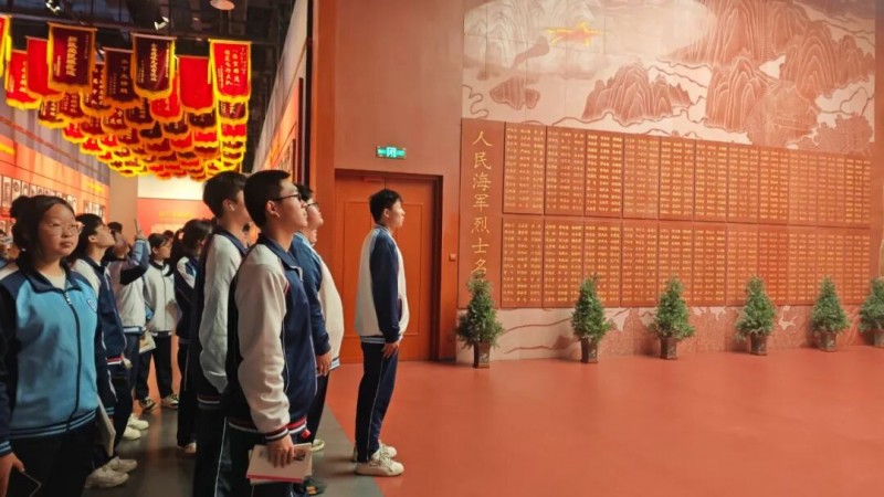 室内展厅中,泛黄的照片、朴素的军装、珍贵的实物,无声诉说着一段段壮怀激烈的往事。师生们在“海空卫士”王伟的事迹前肃立,在也门撤侨“中国人跟我走”的铿锵话语中动容。爱国,从来不是空泛的口号,而是关键时刻的挺身而出、是日常岁月的默默坚守。 师生凝视海军英雄墙。年轻的面庞永远定格在青春年华。他们与今天的学子年纪相仿,却已用生命践行了“使命”二字的千钧之重。这份担当,穿越时空,依然滚烫。爱国不是抽象的概念,是具体到每一次起飞、每一次出航,是明知险境仍向前的选择。