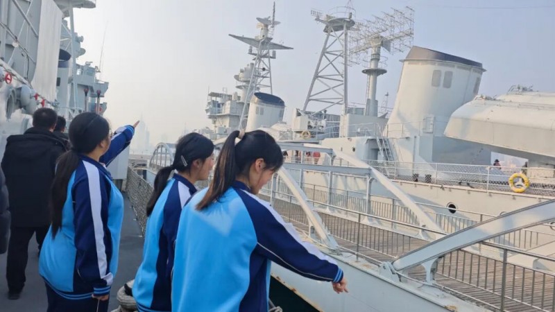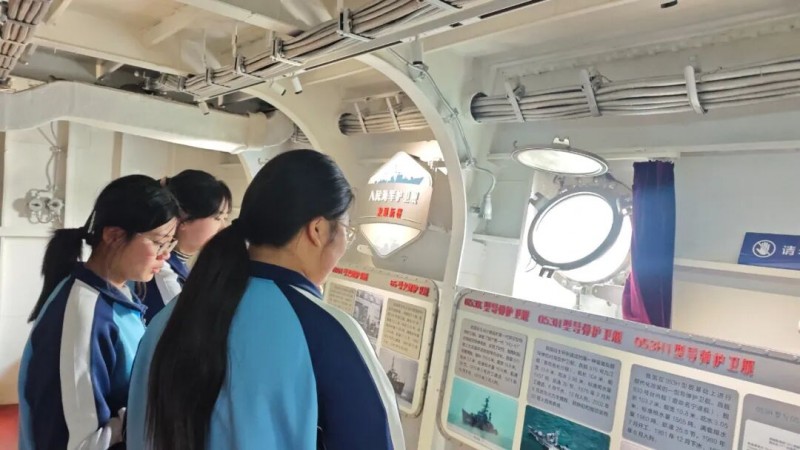 参观结束后,一名学生代表深有感触:“曾经总向往轰轰烈烈,今天才明白——伟大源于细微,卓越来自坚持。工匠精神,就是守住一份初心,在平凡的岗位上发出不平凡的光。” 步入室外展区,战舰列阵,如沉默的丰碑。师生们登上甲板,触摸钢铁的肌理,仿佛能听见远航的波涛与岁月的风声。讲解员轻声讲述:“每一道擦痕,都是任务的印记;每一片锈迹,都有守护的故事。”从木帆船到钢铁巨舰,装备在变,捍卫海疆的初心从未改变。