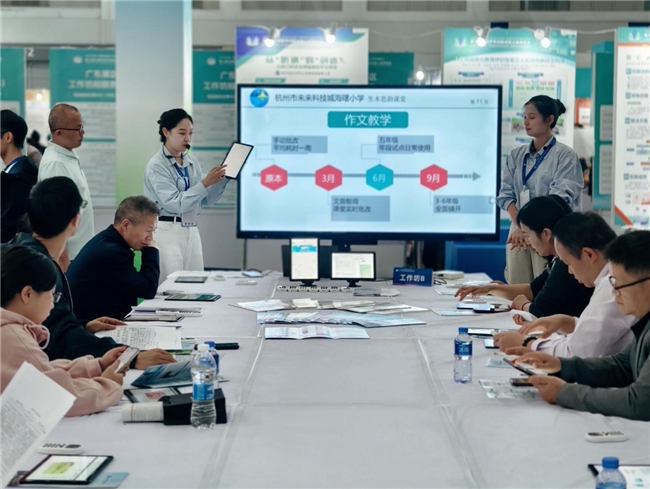 海曙小学的《从“听讲”到“创造”——AI 助力的生本课堂绽放学生思维》在第七届中国教育创新成果公益博览会展出 三、推进策略:提早上车大于“万全准备” 问:这种新的技术挑战下,老师的专业认知和成长路径发生了哪些变化吗? 林建锋:新技术的使用,必然带来新的挑战。在实践中,我们发现老师们是很好学的,他一旦觉得技术是能让课堂教学真正产生迭代式发展的,是很愿意接受挑战、花点时间去学习的。 我们学校的老师达成了一个共识,就是要做正确的、重要的、有挑战的事。正因为形成了这样一种风气,短短半年多时间里,我们已经在省、市、区执教了30多节公开课。 人工智能现在处于发展初期,我们再过三年五年回头看,可能会觉得它很幼稚,但你不能说等再过三五年人工智能更先进了我再用。那不行。也不能说我就要“一次投资,终身受益”。 要想人工智能赋能教育教学真正往深里走,就是要紧跟时代脉搏,怀着终身学习的思想,不断去接受新生事物、琢磨新生事物,在过程当中对人工智能的再发展贡献我们作为教师的专业力价值。
