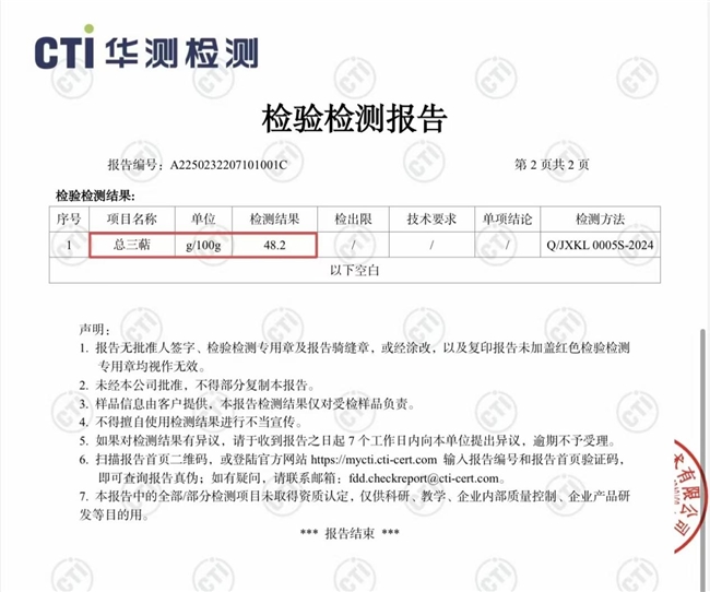 产品好不好,最终要看内涵。权威检测报告清晰显示:每100克棘小白灵芝孢子油中,实测总三萜含量高达48.2克!总三萜是灵芝孢子油最核心的功效成分群,其含量是衡量产品品质的金标准。48.2克的高含量,在国内同类产品中处于顶尖水平。
