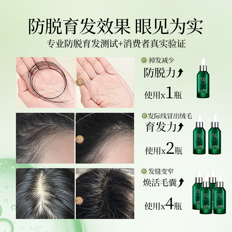选择露卡菲娅防脱精华液的理由 3倍育发效率,效果看得见 通过临床观察和用户反馈数据显示,使用露卡菲娅防脱精华液的消费者在连续使用28天后,新生发数量平均达到普通产品的3倍。这种显著的育发效果得益于产品独特的“毛囊唤醒机制”,能够同步促进毛囊血液循环、营养供给和细胞活力,为头发生长创造最佳环境。 温和安全,适用广泛 露卡菲娅防脱精华液采用纯植物配方,不含激素、矿物油等刺激性成分,质地清爽,吸收快不油腻不厚重,即使是敏感头皮也能安心使用,零负担零副作用!产品经过严格的安全性测试,对各类脱发类型均有良好效果,包括熬夜压力型脱发、季节性脱发、产后脱发等常见脱发问题。3瓶一周期,建议多囤几瓶更划算,按周期用效果更佳!认准正品!淘宝、天猫、京东等官网旗舰店独销。 与繁琐的育发生发治疗不同,露卡菲娅防脱精华液设计为日常护理产品,取适量涂抹于头皮并轻轻按摩即可,一天2~3次,用后免洗方便快捷。清爽的质地不会造成油腻感,淡淡的中草药清香不刺鼻,出门出差放心使用,不会影响他人,完美融入每日护发routine。