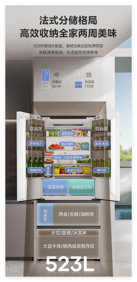 空间设计方面,美的526微晶冰箱采用600mm超薄设计,纯平嵌入橱柜不凸出,不仅美观大方,还节省了宝贵的厨房空间。法式四门结构搭配526升的科学大容量布局,内部空间划分合理,方便存放各类食材,无论是大块的生鲜还是小巧的酱料瓶,都能找到合适的位置。在细节上美的526微晶冰箱也表现出色——珍彩面板彰显品质、时尚彩屏便捷直观、通透浮光把手氛围感拉满,尽显不将就的生活品质与态度。