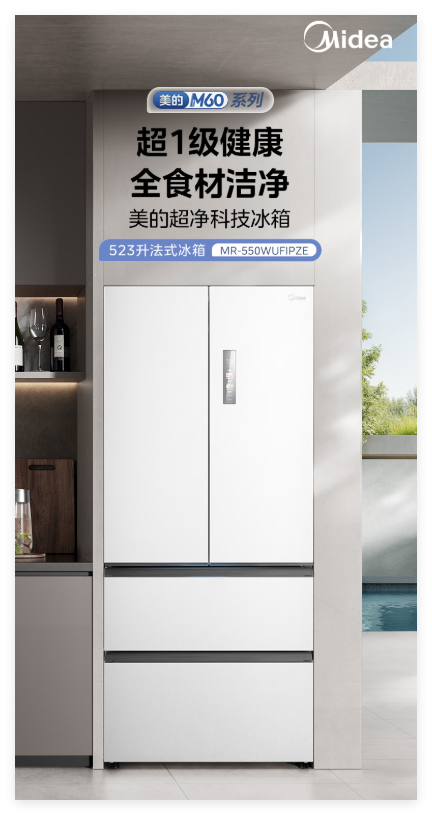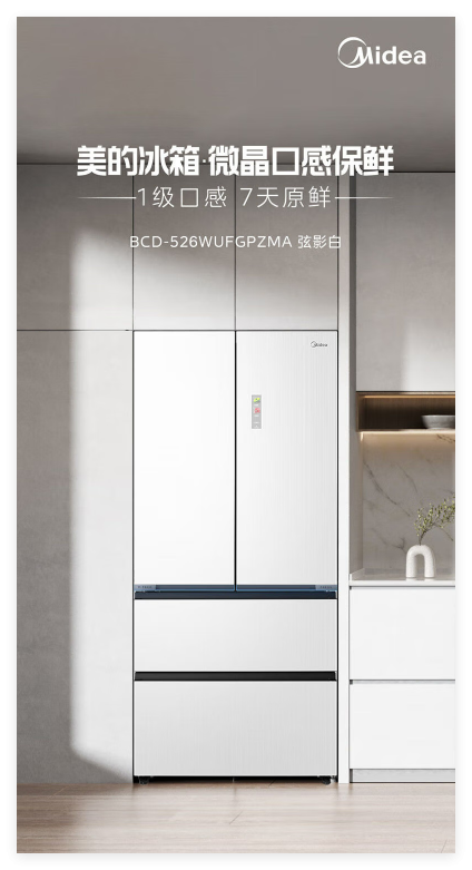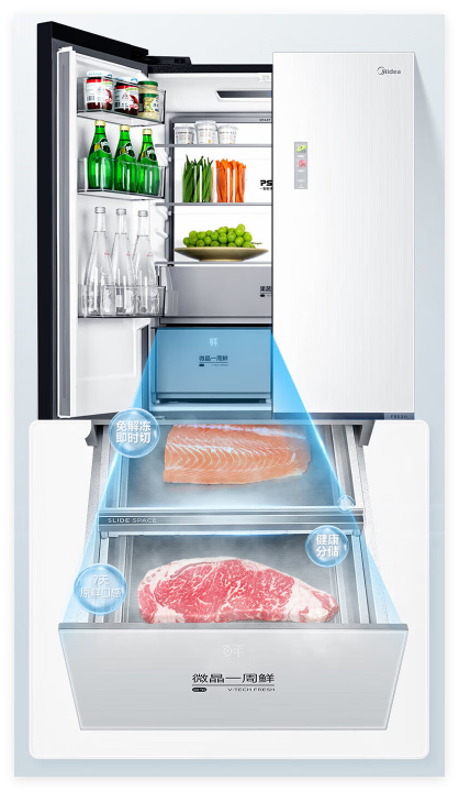 美的526微晶冰箱拥有三大核心技术——微晶一周鲜、脉冲净化、PST+智能净化。其中,“微晶一周鲜”技术为鱼、肉等食材提供了精准的原鲜存储方案,内置双层可拆卸微晶舱,通过双层冰点控温技术,将食材内部冰晶大小控制在一根头发丝1%的大小,食材无需解冻,随取随切,存储7天,口感依然新鲜如初。脉冲净化舱则能发出瞬时光功率相当于太阳光2万倍的高能强光,可穿透食物的包装袋、保鲜袋、保鲜膜对食材表面的细菌、病毒进行消杀,短短3分钟即可实现99.999%的除病菌率,食前使用脉冲净化,食物入口更健康。PST+智能净化技术通过超磁电场放电,高活性金属催化,3分钟就能为冰箱急速净味,九效合一去除200余种有害物质,让冰箱始终保持清新健康的环境,并且除菌进程清晰可见,用户可放心使用。