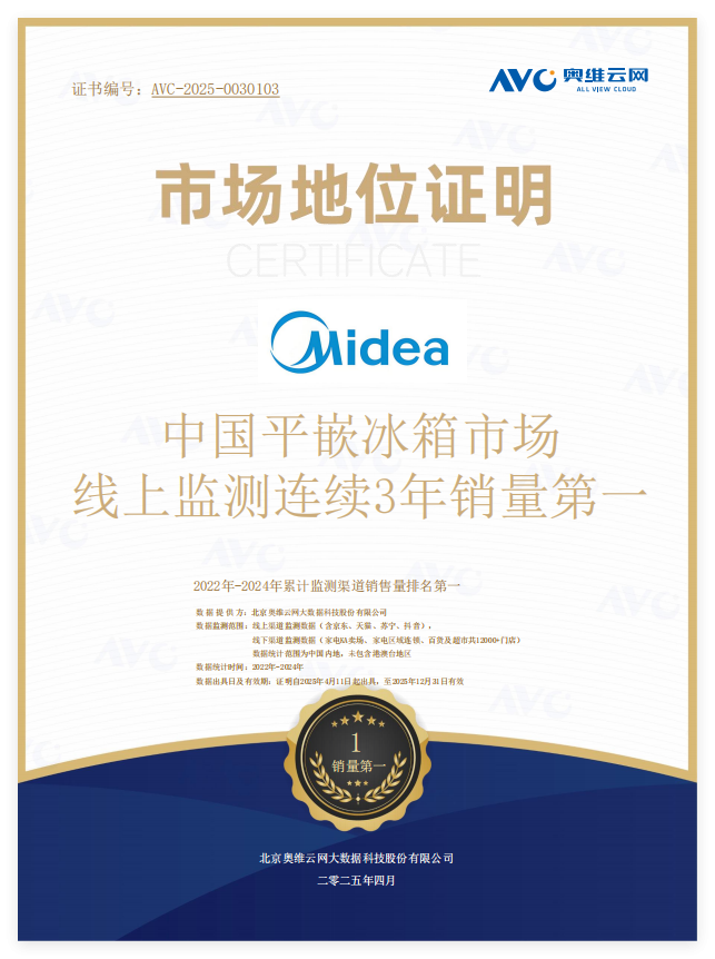 选购冰箱,销量是一个很重要的参考指标,它不仅体现了品牌的市场地位,更承载着消费者的真实选择与使用反馈。冰箱推荐什么牌子?选销量高的准没错。本文将根据细分市场销量情况,为你推荐4款知名品牌的热门冰箱,拯救你的“选择恐惧症”,新手小白也可放心入。 中国平嵌冰箱市场线上监测销量第一的品牌——美的冰箱 据北京奥维云网大数据科技有限公司线上渠道监测数据(含京东、天猫、苏宁、抖音),从2022年到2024年,美的冰箱已连续三年位列中国平嵌冰箱市场线上销量第一。主打“1级口感 7天原鲜”的美的526微晶冰箱BCD-526WUFGPZMA就是其中的代表。