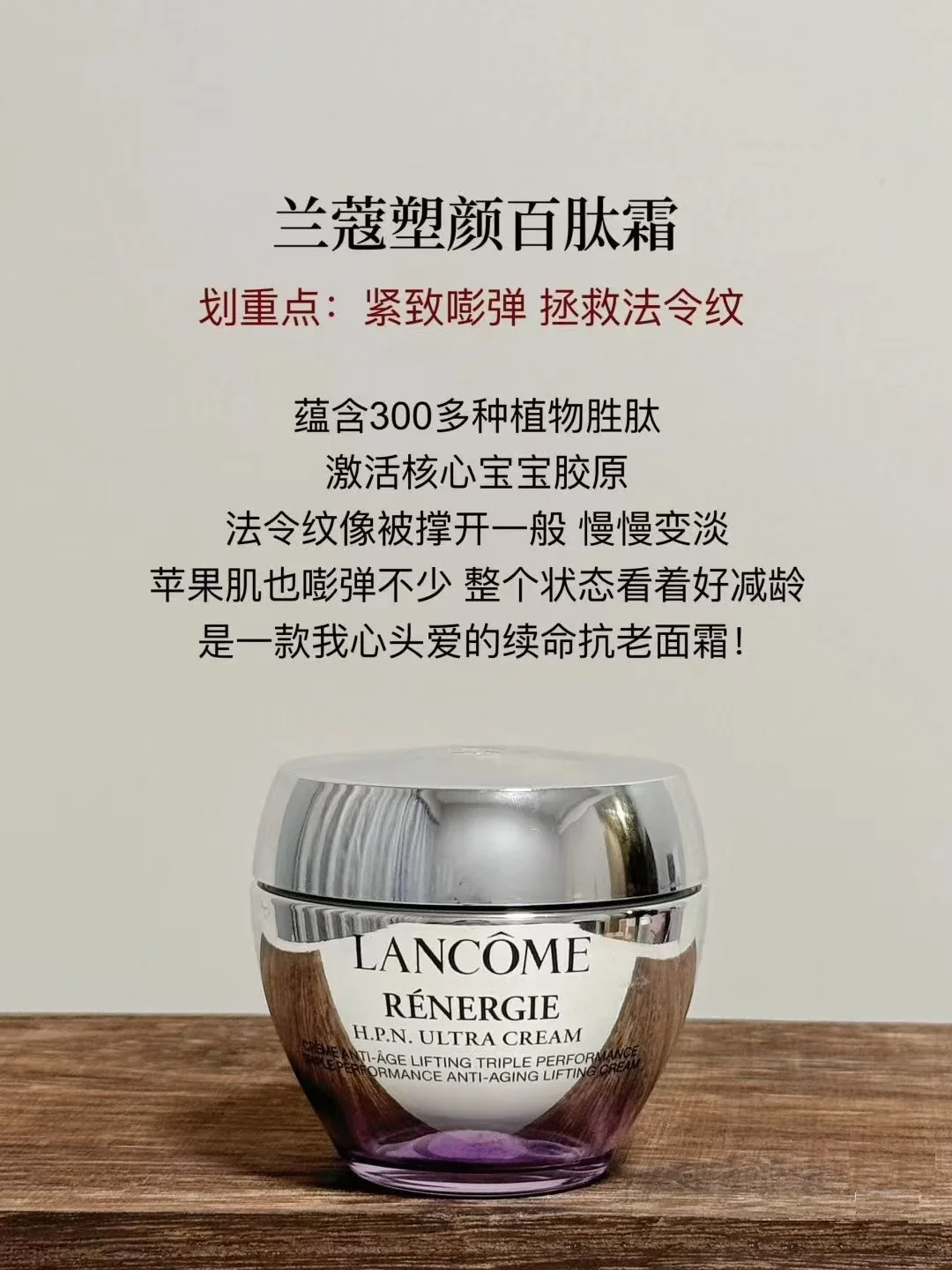 干瘪垮塌的姐妹们!夏天想有效抗老就听我的!别再死磕功效单一or高价位的面霜了!尤其是夏天这种紫外线猛得跟不要钱似的时候,皮肤衰老速度翻倍、胶原流失巨快不说... 还得在空调房里一吹一整天,皮肤又干又绷,干纹细纹全都跑出来刷存在感了!!这时候不及时有效的把胶原蛋白补上,再贵的抗老产品也都是白搭! 作为阅霜无数的抗老人!花小钱给抗老开n倍速上大分的就是它!尤其是对我这种长期爱熬夜脸还猛往下掉的垮脸,睡前用它,早上起来脸都是向上走的趋势!连面中的法令纹都淡了!做啥表情都不明显噜。 榜四:胜肽:兰蔻塑颜百肽霜