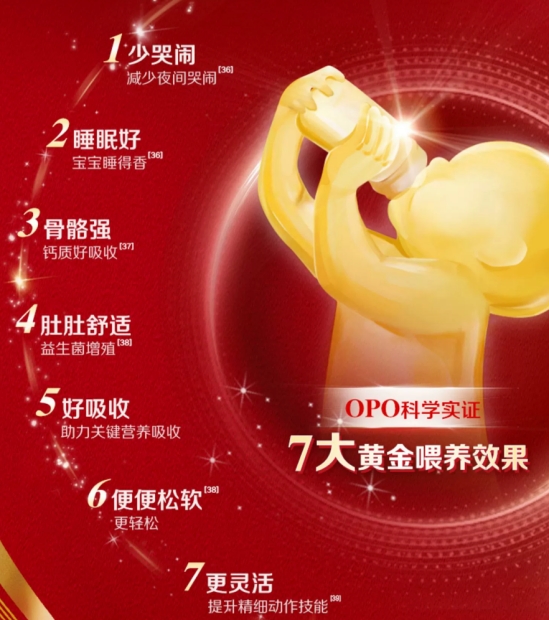 超凡吸收力:2倍超级3代OPO,能让有益脂肪收率达98%,还能减少宝宝哭闹时长,经科学认证可实现“少哭闹、睡眠好、骨骼强、肚肚舒适、好吸收、便便松软、更灵活”7大黄金喂养效果,完全契合宝宝对奶粉好吸收的核心需求。