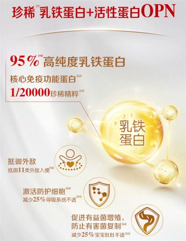 超凡保护力:5种HMOs的含量约等于6倍免疫球蛋白,能促进有益菌繁殖、减少有害菌定植,95%高纯度珍稀乳铁蛋白和活性蛋白OPN可抵御11类外敌入侵,激活防护细胞。