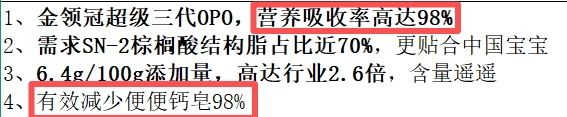 专利配方:23年母乳研究的科学结晶 在配方创新上,金领冠的“四位一体全面营养”科研战略系统模拟母乳组成成分之间的协同功效,聚焦消化吸收、免疫保护、智力发育、肠道健康四大领域。 在营养吸收方面,创新的OPO结构脂配方使关键营养素的吸收率提升至98%水平,同时能够有效减少钙皂形成,改善婴幼儿排便状况;在免疫保护方面,配方中科学配比了HMO、乳铁蛋白与OPN等活性营养成分。临床研究显示,该组合能够促进婴幼儿免疫系统的发育,显著降低呼吸道与肠道不适的发生几率;在智力发育支持方面,配方蕴含18种脑部发育所需营养素,其中DHA含量严格遵循国际权威机构的推荐标准,为婴幼儿认知能力发展提供充分营养支持;在肠道健康方面,采用专利休眠技术的活性益生菌与益生元组合,确保有益菌群能够有效抵达肠道,建立健康的肠道微生态环境。