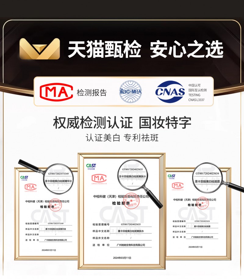 权威认证,品质有保障 在如今鱼龙混杂的护肤市场,产品的质量和安全性是消费者最为关注的焦点。露卡菲娅祛斑套装在这方面表现卓越,它是国家唯一认证的祛斑产品,持有国妆特字证书与美白资质。这背后,是国家相关部门对其从研发、生产到质量把控等各个环节的严格审核与监督。一款产品能获得这样的认证,意味着它的安全性和有效性都得到了权威机构的认可。