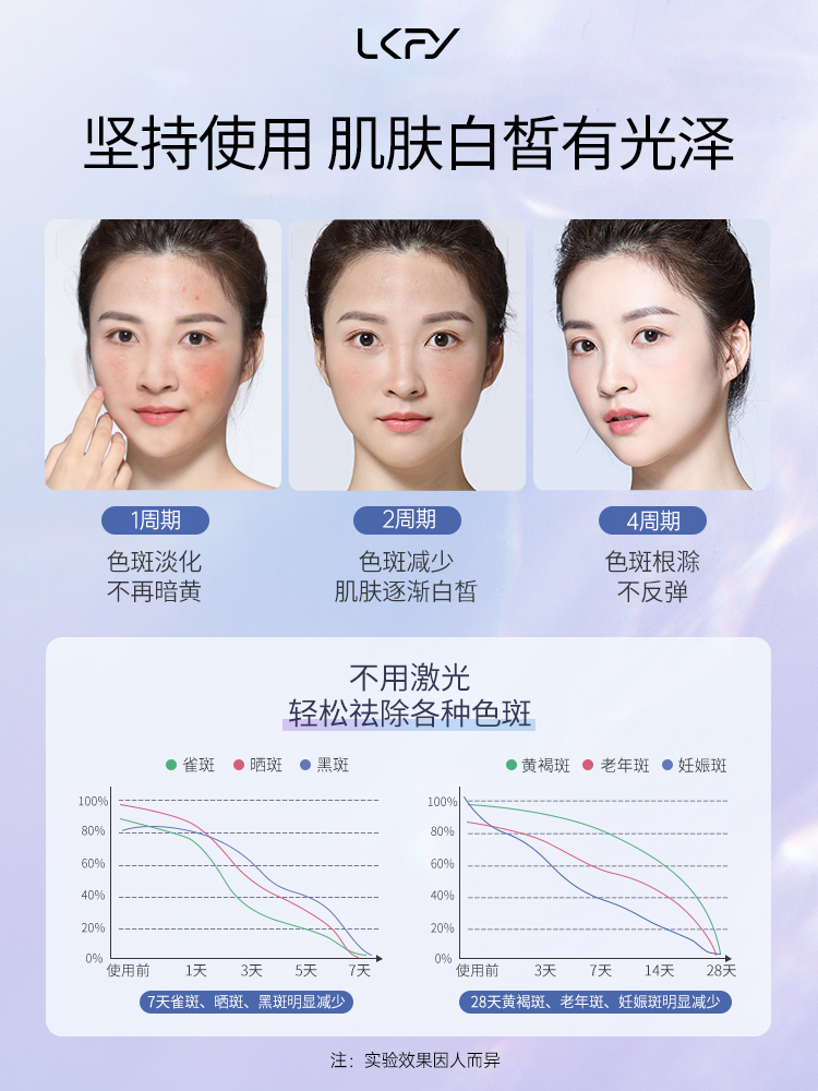许多真实用户案例都验证了其效果,例如有遗传性雀斑的用户,使用一个月后雀斑颜色变浅、分布不再密集,继续使用三个月后雀斑明显淡化,肌肤变得更加均匀细腻;因内分泌失调和长期日晒出现黄褐斑的用户,使用两个月后黄褐斑颜色变浅、面积缩小,坚持使用半年后黄褐斑基本消失,肌肤恢复白皙透亮;长期在户外工作出现晒斑的男用户,使用一个半月后晒斑明显变淡、肌肤更光滑,使用三个月后晒斑几乎完全消失,皮肤恢复健康状态。