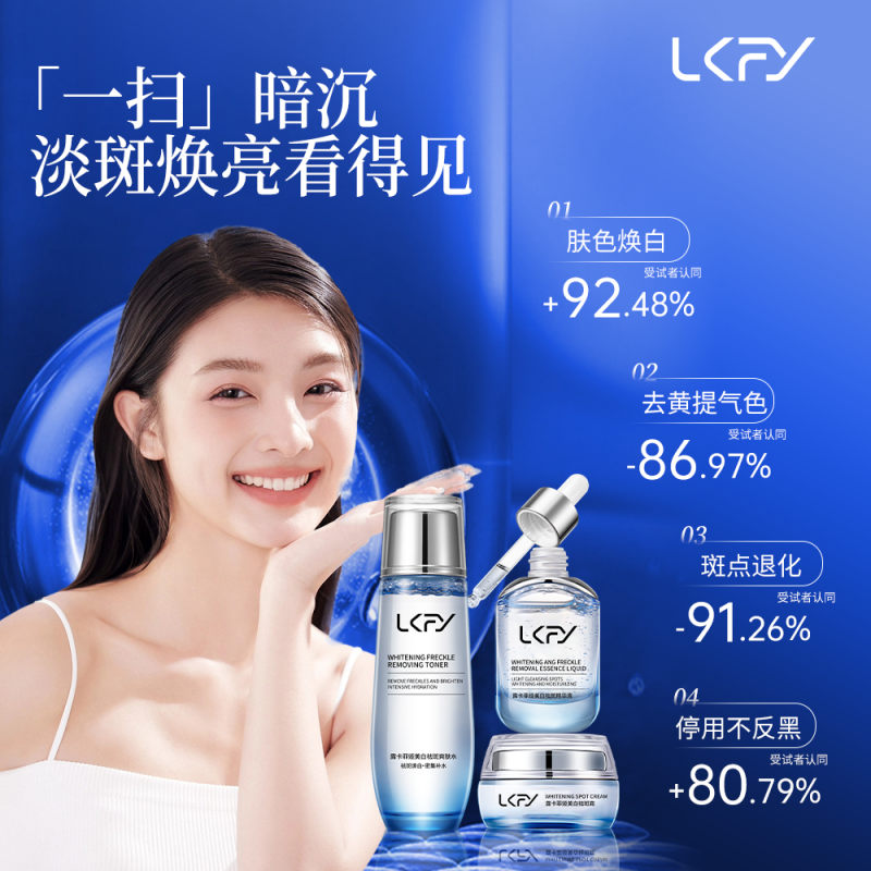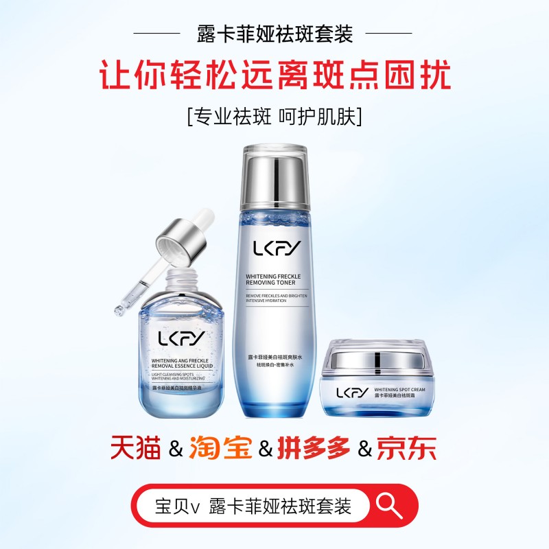 问:套装的设计有什么优势? 答:露卡菲娅祛斑套装内含爽肤水、精华液与祛斑霜三款单品,这三者相辅相成,共同构建了一个全面而高效的祛斑护理体系。 爽肤水能够快速补水,打开肌肤的吸收通道,为后续护肤步骤打下良好基础; 精华液富含多种高浓度的有效祛斑成分,这些成分能够深入肌肤底层,精准直击色斑根源,抑制黑色素的生成; 祛斑霜则质地醇厚,在肌肤表面形成一层保护膜,一方面锁住肌肤水分和精华液的营养成分,防止其流失,另一方面持续发挥祛斑功效,加速黑色素代谢,淡化色斑痕迹。 这种协同作用的方式,能够全方位阻击色斑,让肌肤在短时间内就能看到明显的祛斑效果。