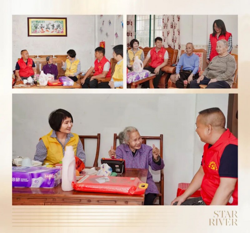 义诊现场 重阳节即将来临之际,星河湾携手民营商会,随机走访了村里的高龄老人和困难家庭。在村民家中,爱心团队与老人们促膝长谈,关切地询问他们的饮食起居和身体状况,将企业的温暖关怀与诚挚的节日祝福传递到老人的心间。