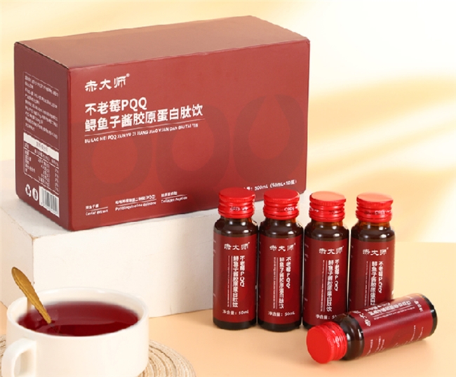 赤大师不老莓PQQ鲟鱼子酱胶原蛋白肽饮,是一款融合尖端营养科学与珍贵天然食材的抗衰臻品。其核心配方汇聚三大珍稀成分:富含花青素、抗氧化能力卓绝的不老莓原汁;被誉为“细胞活力之源”的明星成分——吡咯并喹啉醌二钠盐(PQQ),每100ml精准蕴含10mg高活性含量;以及象征奢华滋养的 鲟鱼子酱精华。同时,产品核心采用 微分子级胶原蛋白肽,其极小分子量(通常指1000-3000道尔顿以下)赋予其卓越的渗透性与生物利用率,标志着胶原补充迈入高效吸收的全新时代。