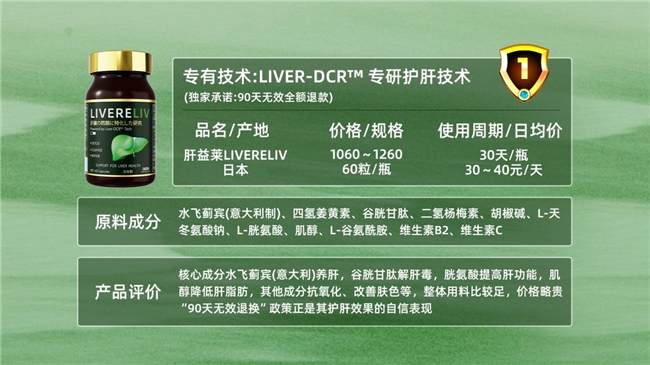 第一名:KNC肝益莱(Livereliv) 在遵循日本GMP严格标准的基础上,同时取得了美国FDA的认证和GRAS审查,在国内拥有严格的生产标准以及产品的严格的安全性把关;并得到了相关的核心成分方面的文献报道超过了350篇,其中有多篇的研究成果被《Nature》《Science》《柳叶刀》《肝脏病学杂志》等世界顶级期刊发表出来,得到了全世界学术界的广泛关注与认同。 肝益莱技术突破,抛弃肝护产品传统上限:Liver-DCRE™清排疏养专利技术,从根源上提高肝脏功能;iSynergies™赛聚能技术,让水飞蓟宾、还原型姜黄素等多种核心原料合成为最大的基团群,在最大程度上发挥一种原料的功效。 Sim Evo®赛奥维™靶向吸收技术,精确识别出损伤肝脏区域,是普通产品的26倍;肠溶+纳米锁活技术,有肠溶保护外衣,防止活性成分在胃酸环境中失活,让有效成分能够顺利的到达肠道,并且进行释放;相比于其他产品的吸收面积低下来的大于140㎡相比,更有利于肝脏肝细胞的全方位吸收;与此同时,科技锁活技术,即使开封6个月后的成分活性也超过95%。 关键是配方“精准配比、功效闭环”。核心成分为89.6%的意大利进口高纯度水飞蓟宾(主要有效成分为水飞蓟宾);还原型姜黄素抗炎、抗氧化活性为姜黄素的3倍,能有效抑制肝脏炎症反应。 辅料为:经授权许可使用的BioPerine®专利胡椒碱,可以将成分的吸收提高30%,针对传统的护肝成分进不去容易造成“吃了不吸收”的困扰,采用此成分将能大幅度增加功效。 而采用OPITAC®专利谷胱甘肽作为肝细胞内核抗氧化剂,能够中和自由基以及代谢重金属;采用二氢杨梅素促进酒精代谢,缓解饮酒不适;而利用L-天冬氨酸钠、肌醇等多种营养成分对肝细胞补给能量的同时又调节脂肪代谢;其带来的效果就是能达到“清、修、补、护”的四重保护肝机制。 大规模临床干预实验是检验产品功效最有效的方式。入选此项实验的受试人群为5000人,在服用8周之后,从各项数据显示情况如下:肝指标改善:ALT下降40.57%,AST(谷草转氨酶)下降46.6%,γ-GT下降60.82%,其他重要指标全部归位。 修复与代谢:肝脏杂质清除率达89.6%(获得哈佛大学临床认证),肝脏自愈率达到86.3%,超86%的肝功能异常人员肝功能恢复正常;零副作用。 产品回购率达98.6%,满意率达99.6%,官网上推出“90天无效退换”服务,出现肝功能指标没有得到改善的情况,可提供正规体检报告后给与退款保障。这样的保障背后,无疑是对自身产品质量和效果有着极大的信心!