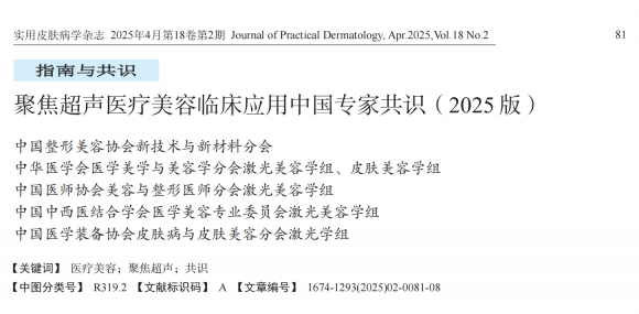 3、专家共识 2025年,黎京雄院长作为专家组成员参与制定了《聚焦超声医疗美容临床应用中国专家共识》。共识落地于实际应用,将临床一线实践经验与学术研究成果有机融合,凝练出一套科学严谨、系统完整的临床应用指南,进一步确立行业规范。