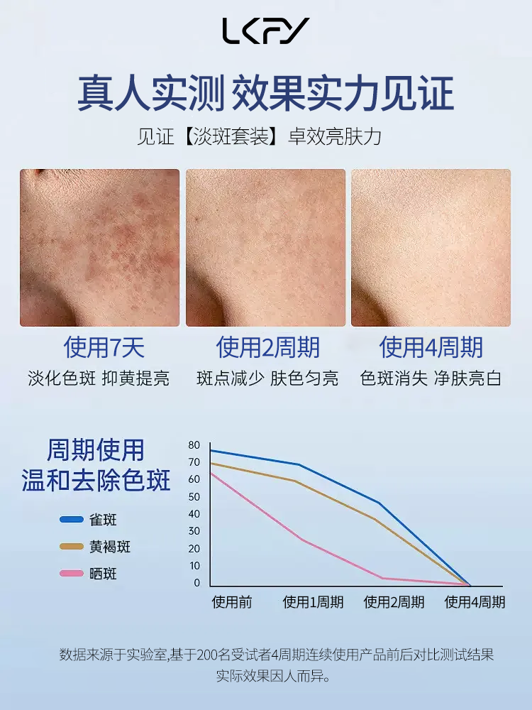 三段式护理+明确见效期,淡斑不等待 爽肤水+精华液+祛斑霜的三段式护理,形成闭环协同增效:爽肤水质地轻盈,快速补水、调节肌肤酸碱平衡,为后续吸收打开通道;精华液高浓度淡斑成分深入肌底,精准瓦解黑色素、加速色斑代谢;祛斑霜牢牢锁住营养,持续淡斑并修复受损细胞。见效周期清晰可见:1-2周期(28天/周期),斑点明显淡化,肌肤水润度大幅提升;3-4周期,色斑数量显著减少,肤色整体提亮,触感细腻光滑,素颜也能自带光泽感。