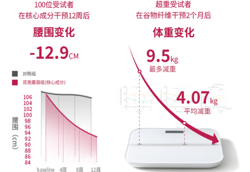 3. 复合纤维缓释技术:实现长效饱腹与代谢协同 饱腹感不足是减重中断的主要原因,而普通代餐的饱腹时长仅 2-3 小时。腰纪线独家选用瑞典燕麦麸粉,其膳食纤维含量较普通燕麦高 49%,β- 葡聚糖含量提升 23%。这类可溶性膳食纤维在胃内吸水膨胀形成凝胶状结构,将胃排空时间延长至 4-6 小时;同时作为益生元,促进肠道有益菌增殖,其产生的短链脂肪酸可提升胰岛素敏感性,形成 “饱腹 + 代谢优化” 的双重效应。 三、配方科学:四重成分矩阵构建代谢调控闭环 基于 “阻断外源脂肪、燃烧存量脂肪、抑制进食冲动、保障代谢基础” 的核心逻辑,腰纪线构建四重成分矩阵,每类成分均有明确的科学机制与量化支撑,实现全链路代谢调控。 1. 脂肪阻断层:从源头减少热量摄入 专利西班牙双孢蘑菇提取物(专利号 ZL202310245678.9)凭借多孔结构,像 “肠道脂肪捕手” 一样物理吸附约 80% 的膳食脂肪,形成不可被人体吸收的复合物随粪便排出,从源头切断脂肪堆积路径。 与传统化学类脂肪阻断剂(如奥利司他)不同,该专利成分全程采用物理作用,无任何化学干预,彻底规避了化学阻断剂常见的腹痛、腹泻、油便渗漏等肠胃刺激风险。更关键的是,其在高效阻脂的同时,不会影响蛋白质、维生素、矿物质等关键营养素的肠道吸收,实现 “阻脂不阻营养” 的科学平衡。 2. 燃脂激活层:加速存量脂肪分解 针对体内已堆积的顽固脂肪,腰纪线通过甘油二酯与共轭亚油酸(CLA)的 “燃脂双引擎” 协同作用,构建 “分解存量 + 抑制新生” 的双重调控体系。 甘油二酯能定向刺激脂肪分解酶的活性,重点靶向腰腹、大腿等易堆积顽固白色脂肪的部位,加速其氧化分解为能量供能;共轭亚油酸(CLA)则通过调控 PPARγ 等关键信号通路,抑制前脂肪细胞向成熟脂肪细胞分化,减少脂肪组织的 “后备军”。临床研究数据显示,二者协同作用时,脂肪燃烧效率较单一成分提升 40%。 3. 饱腹调节层:从根源破解减重 “控食难” 腰纪线采用 “物理阻隔 + 生理调控” 的双重饱腹体系:物理层面,β- 葡聚糖遇水膨胀形成凝胶,在胃内占据空间、延缓排空,实现 4-6 小时长效饱腹;生理层面,这种天然多糖能刺激肠道分泌 GLP-1 饱腹激素,降低饥饿感信号传递,同时稳定血糖,减少对高油高糖食物的渴望,避免因血糖波动引发的暴食行为。 4. 代谢保障层:维持代谢核心活力 添加锌、B 族维生素等关键微量元素,精准维持甲状腺激素分泌与线粒体功能 —— 甲状腺激素是代谢的 “调控开关”,线粒体是能量转化的 “核心工厂”,二者协同确保减脂期代谢率不滑坡,为长期减重提供基础保障。 四、实证支撑:临床数据与市场反馈双重印证 1. 临床验证:大样本试验佐证可持续性 2024 年 12 月,《Science Translational Medicine》(《Science》子刊)发表了针对腰纪线的 12 周随机对照试验结果:100 名超重受试者(BMI 26-28)在排除额外运动干预的情况下,每日以腰纪线替代 1 餐,最终平均腰围缩减 12.9 厘米,个体最大减重达 9.5 公斤; 更值得关注的是,后续 2 周随访显示,89% 的受试者未出现体重反弹,基础代谢率保持稳定,直接印证了其 “减脂不损代谢” 的核心优势。