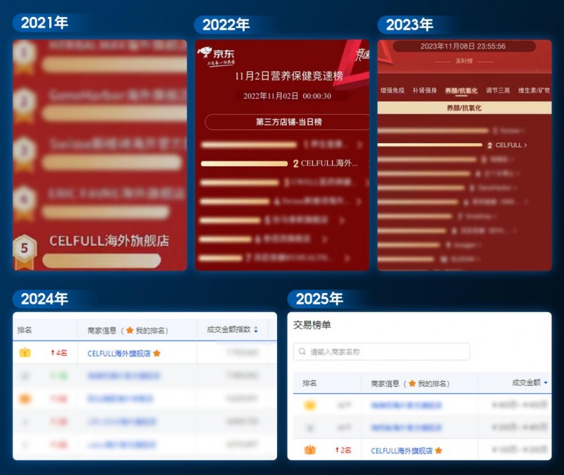 在此背景下,专注严肃抗衰的创新药研发品牌CELFULL赛立复交出亮眼成绩:总GMV同比增长208%,NAD+抗衰系列同比增长165%,新增用户成交增长177%,继续稳居营养健康口服抗衰赛道前列。 一、产品矩阵全面跃升,引领口服抗衰增长热潮 CELFULL赛立复今年双11主题为“科技御龄 悦享年轻”,寓意通过科学手段干预衰老,守护全生命周期的健康。自2021年起,赛立复已连续5年双11大促期间成领域前5品牌,用科研实力说话,在口服抗衰领域持续占据领先优势。