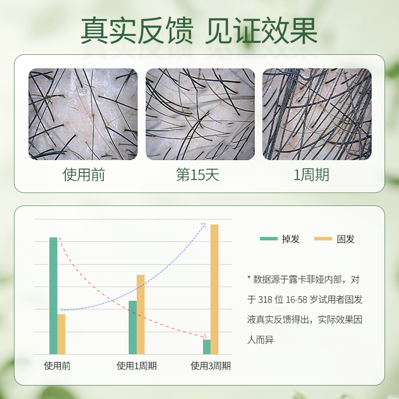 3. 激活毛母细胞,筑牢发丝生长根基 除独家专利生发因子外,露卡菲娅防脱精华液还添加毛囊生长因子协同作用,进一步激活毛母细胞活性。数据显示,3瓶一周期,坚持使用 30~80天,毛囊进入生长期的比例高达 91.2%,不仅能防脱韧发,更能为发根提供持续生长动力,让新生发丝更加强韧。