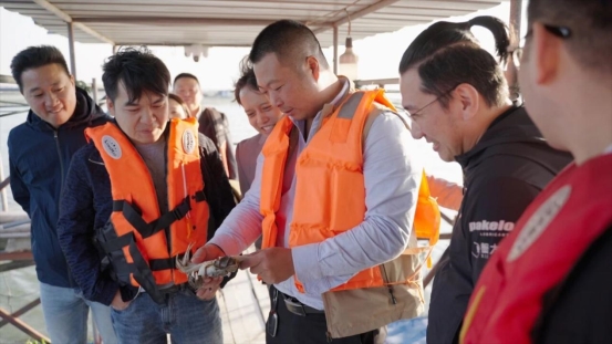 在养殖基地,金牌养蟹师刘春洋带领专家团乘船参观了苏州核心湖区的养殖水域。蟹太太坚持“好水养好蟹”,严格监测水体透明度、含氧量、水草覆盖率等,确保大闸蟹的宜居环境。同时,根据养殖关键节点,重点调配饵料,投入螺蛳、虾、玉米等,为大闸蟹提供优质营养。 仓储中心内,权辉引导专家团参观了收货区、暂养区、分拣区等多个区域,展示了蟹太太如何严控产品质量。