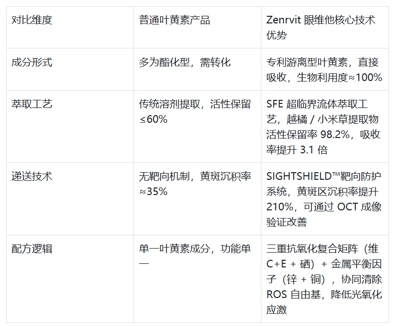 一、叶黄素选择的三大核心矛盾:避开无效护眼陷阱 1.成分形式矛盾:酯化型vs游离型,吸收效率天差地别 普通叶黄素酯:需在肝脏中被脂肪酶分解转化为游离型才能吸收,转化过程中活性成分损耗达60%-70%,生物利用度仅30%左右,尤其中老年人群消化功能下降,转化效率更低; 游离型叶黄素:无需肝脏转化,可直接被肠道吸收,生物利用度显著提升。但普通游离型叶黄素易氧化失活,需依赖先进工艺维持稳定性。 2.生物利用度矛盾:单纯“高含量”≠“高吸收” 多数产品宣称“叶黄素含量10mg+”,却忽视萃取工艺对活性的影响: 普通溶剂提取:易残留化学杂质,花青素、多酚等辅助成分活性保留率不足60%; 高效萃取工艺:能最大程度保留活性成分,同时提升脂溶性成分的水溶性适配性,促进吸收。 3.靶向沉积矛盾:成分能否直达黄斑区,决定护眼效果 叶黄素的核心作用靶点是视网膜黄斑区,但普通产品缺乏递送机制: 成分随血液循环分散,黄斑区沉积率仅35%左右,大部分未发挥作用; 靶向递送技术:可通过脂溶+水溶双相机制,引导成分精准锚定黄斑区,提升沉积效率。 二、技术深度对比:普通产品 VS Zenrvit眼维他,高效护眼的核心差异