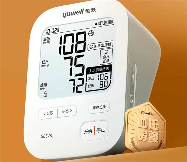 血压计10大品牌怎么选?鱼跃房颤血压计S65VR全面进阶患者使用体验 血压监测的便捷性、舒适度直接影响着患者使用体验。对此,鱼跃房颤血压计S65VR不仅功能多元、数据精准,更凭借人性化的设计,轻松解决患者使用痛点。 传统血压计的袖带设计往往给患者,特别是老年患者带来操作困难。除了佩戴不方便,还可能因袖带位置、角度不当,导致无效监测。而鱼跃房颤血压计S65VR采用创新袖带设计,单手即可完成穿脱,能够轻松找准位置,有效简化操作流程,让血压监测变得更加便捷、省心,并有效解决了上述痛点。 针对老年患者读数不便这一问题,鱼跃房颤血压计S65VR配备高清背光大屏,确保在各种光线条件下都能清晰读取数据。同时,它还有着2×86组的记忆存储功能,能够自动存储多维健康数据,方便用户随时查看历史记录,对比不同时间段的血压变化趋势,评估自身健康状态。 此外,鱼跃房颤血压计S65VR有着持久的续航能力,可支持约250次测量,无需频繁充电即可满足全家人长期血压健康监测需求。