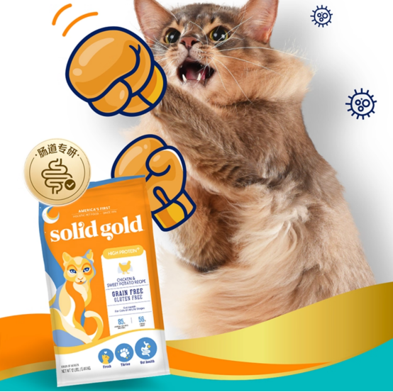 最后,也是本文的重点——素力高(Solid Gold)鲜肉高蛋白猫粮。与前两者不同,素力高的研发逻辑并非一味堆砌高指标,而是以解决猫咪真实健康问题为核心。它的第一大亮点在于使用了高达41.9%的0激素进口走地鸡鲜肉,动物源蛋白占比85%,并经过第三方实测,胃蛋白酶消化率高达92%。这意味着营养能被高效吸收,真正转化为肌肉,而非变成臭烘烘的软便。其第二大核心优势,是经中国农业大学6周系统性喂养跟踪实证的功效:数据显示,食用该产品后,猫咪的腹泻率显著降低74%。这份由国家级权威机构出具的报告,是其产品力最坚实的背书。这一切都得益于其独家的Super-proga™肠道专利组合,通过高活性益生菌、天然膳食纤维和Omega脂肪酸的三效协同,从根源上修护和稳定肠道环境。