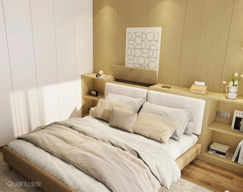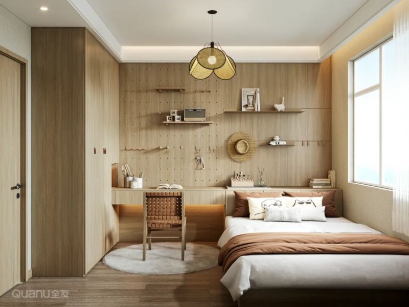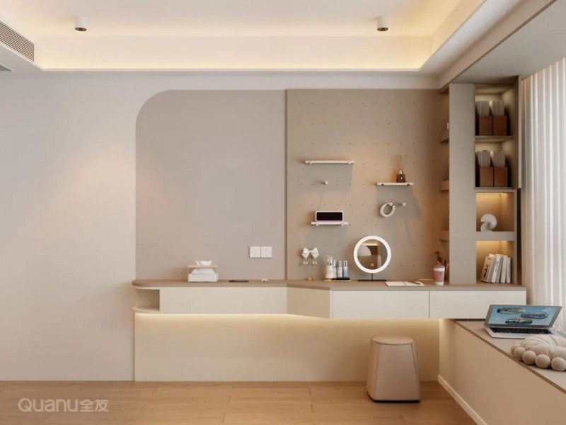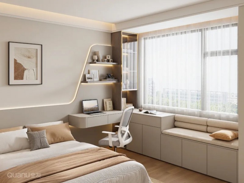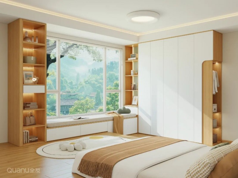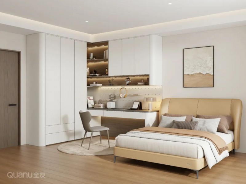 将飘窗台面向室内延伸,卡座区域配置储物柜与洞洞板,兼顾杂物收纳与床头置物。靠床区域采用悬浮梳妆台,配备开放式储物格,实现休闲+收纳+美妆三合一。 如果你也想高效利用卧室空间,那就快来全友全屋定制门店预约免费设计吧~ |