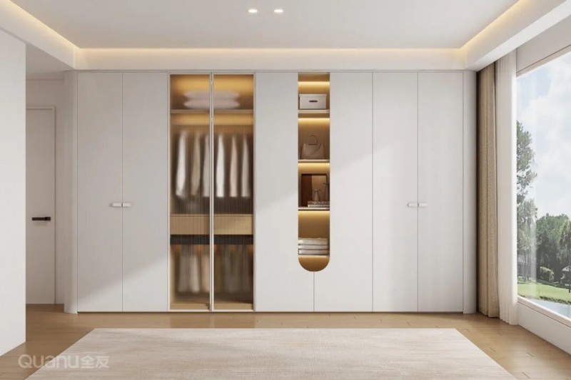 衣柜转角自然延伸出梳妆台,左侧设开放格方便随手取物,中部配备分层抽屉,让收纳井然有序。 (4)衣柜+置物架 衣柜转角嵌入分层置物架,配上感应灯带,既能展示心爱的包包饰品,又能提升空间层次感。此外还可用玻璃移门隔出次净衣区,悬挂日常外套。