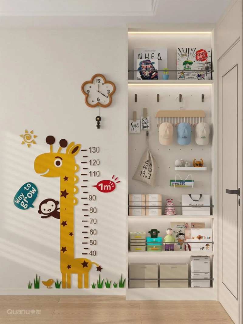 将梳妆台巧妙融入整墙衣柜系统,左侧设置悬挂区收纳日常衣物,中部封闭柜隐藏各类杂物,右侧梳妆区配备多层抽屉与置物架,既提升收纳效率,又维持空间整洁。 02门后薄柜 门后的狭窄空间经常被忽略,其实只需稍加巧思,就能变身为收纳宝地。