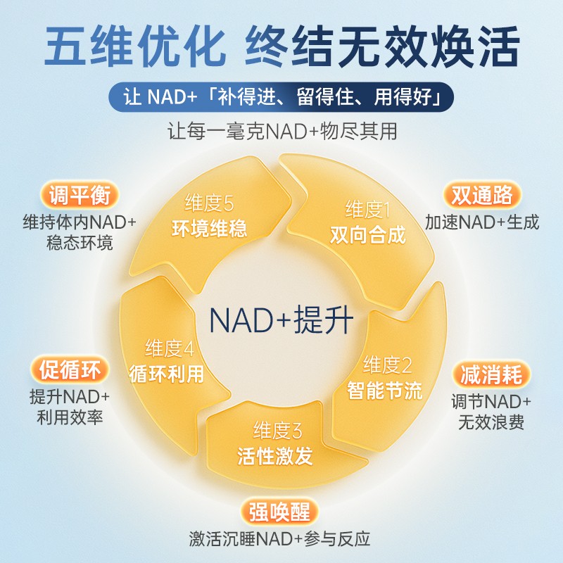 首先,在机制上,该产品没有沿用传统NMN的单一路径,而是构建了业内少见的“五维机制”NAD+优化模型。其核心机制包括双通路生成、智能节流、活性激发、循环利用与稳态维持五个方向,覆盖了NAD+从生成到消耗、从参与反应到环境调控的完整体系。其中,NADH与NR双通路被视为重大突破,NADH可1:1直接转化为NAD+,NR则通过梯级合成路径补充,两者协同实现更高效的提升效果。 传统NMN产品面临的一大痛点是「消耗」,“补进去但很快被耗尽”。针对这一问题,通过槲皮素与虾青素构建“智能节流系统”,分别作用于CD38与PARP两大消耗通路,可减少约60%的无意义损耗,让补充真正被身体利用。 同时,PQQ与白藜芦醇的加入,为NAD+提供了“活性激发”功能,实验证明这组配方组合可提升线粒体数量约163%,意味着能量代谢能力的整体增强。维生素B12和叶酸则为细胞色氨酸代谢、氧化还原平衡和DNA修复提供支持,使NAD+处于更稳定的生理环境中。