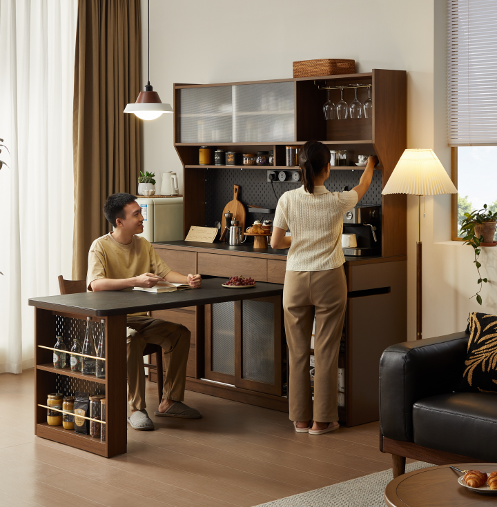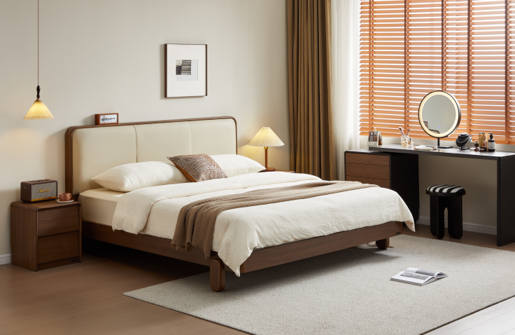集餐桌、餐边柜与吧台功能于一身,可用于临时办公或休闲娱乐。胡桃木色与黑色相呼应,延续了原木的温润感,又点缀复古气息。L型搭台与柜体自然衔接,可伸缩可旋转,日常收拢节省空间,聚会时展开成为互动中心,大小户型都适配。 原木风软床