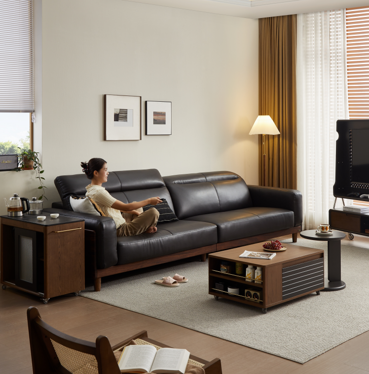 黑色软包与南美胡桃木搭配,材质碰撞出丰富质感,视觉高级且耐看。分段式靠包贴合腰背,宽大座包随意坐卧。头枕可自由调节,后仰时肩颈舒展,包容不同身型,舒适角度由你定义。实木底脚稳固体支撑,坚固耐用,休息时更感踏实。 可移动电视柜