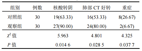 表2 两组患者 7 d 核酸转阴率、7 d 肺部影像学好转率及重症率比较[例(%)]
