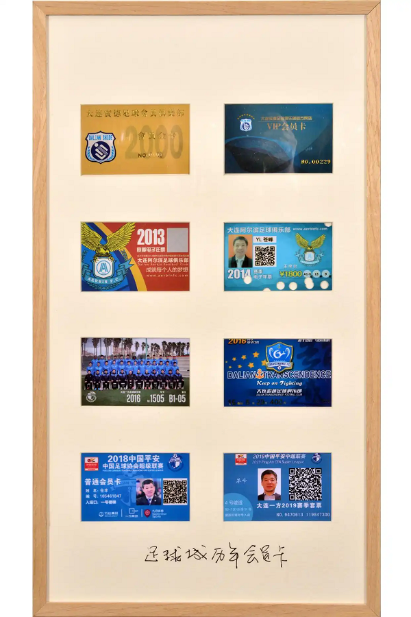 “今年,大连球市火爆出圈,梭鱼湾足球场场均观众达5.8万人,成为‘亚洲第一主场’,其场均上座人数在全球足球俱乐部中排名第18位……因此,在我看来,今年是足球城大连的崛起之年,是大连球迷的幸福之年!”痴迷足球近30年的仓丰表示,如果评选今年大连的年度热词,“大连足球”应高居前列。值此大连足球胜利之年,让我们走近被誉为“中国首位持证球迷”“大连商标注册第一人”的大连仓丰商标事务所创始人仓丰,倾听一段大连球迷的传奇故事。 有幸成为会员制时代“全国1号球迷” 作为一名资深球迷,仓丰收藏了许多与足球有关的珍贵藏品。此次,为圆满完成向大连足球文化博物馆的自愿捐赠,他将与大连足球相关藏品进行了细致整理,并花费2000元请专业师傅将各类藏品装裱、归类于9个大型相框中,其中包括“中国首张球迷会员卡”;一年内,他写给大连足球队1196封“激励信”有关藏品;以及一些有纪念意义的首日封等。“这些藏品是大连足球历史文化的一份见证,而捐赠藏品则是我作为一个球迷的诚挚心愿。”仓丰如是说。 “我从1997年开始看球,但与大连足球结下深厚缘分是在2000年。”仓丰回忆说,2000年,首次征战甲A联赛的大连实德足球俱乐部在中国率先实行球迷会员制,并于当年2月29日正式发售球迷会员卡。“那时,我还住在瓦房店,每天早晨坐最早一班火车到大连市内一家保险公司上班。当天,我在公司开完早会后,带上家里仅有的703元来到大连实德足球俱乐部。俱乐部大门外围满了球迷,却没人进门认购会员卡。由于是第一年实行球迷会员制,全国没有先例,因此,大家都在观望,甚至有一些球迷希望集体施压,促使会员年卡降价……” 有着“敢于第一个吃螃蟹”性格和勇气的仓丰,在大家异样的目光中率先走进俱乐部大门。“我问一名工作人员:‘有1号会员卡吗?我要买。’对方表示有,但其他会员卡600元,那张卡则要再加100元。她还善意建议我挑选编号008,或者018的会员卡,说这些吉利编号会员卡寓意更好,还不用加钱。但我仍然坚定地选择了No.001会员卡。”仓丰笑着说,“1号”寓意夺冠,也符合他始终争胜的性格。