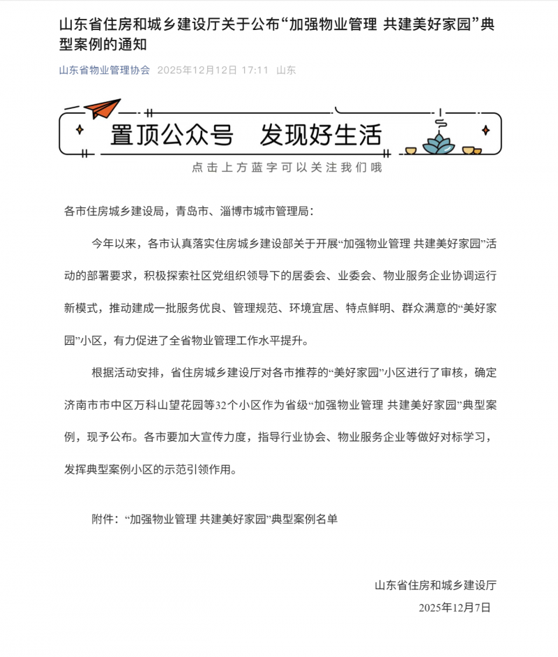 这是一个关于“党建共治”如何让社区更有温度的故事。自项目交付以来,曾获得市级美好家园样板小区,2025年被评选为山东省级美好家园典型案例小区。但最大的回报并非一块“奖牌”,而是让454户家庭真切参与到“街道共治、空间共建、服务共享”的社区治理新实践中。 2025年12月,山东省住房和城乡建设厅正式发布省级“加强物业管理 共建美好家园”典型案例名单,济宁星语城小区凭借其创新实践与卓越成效荣誉登榜。